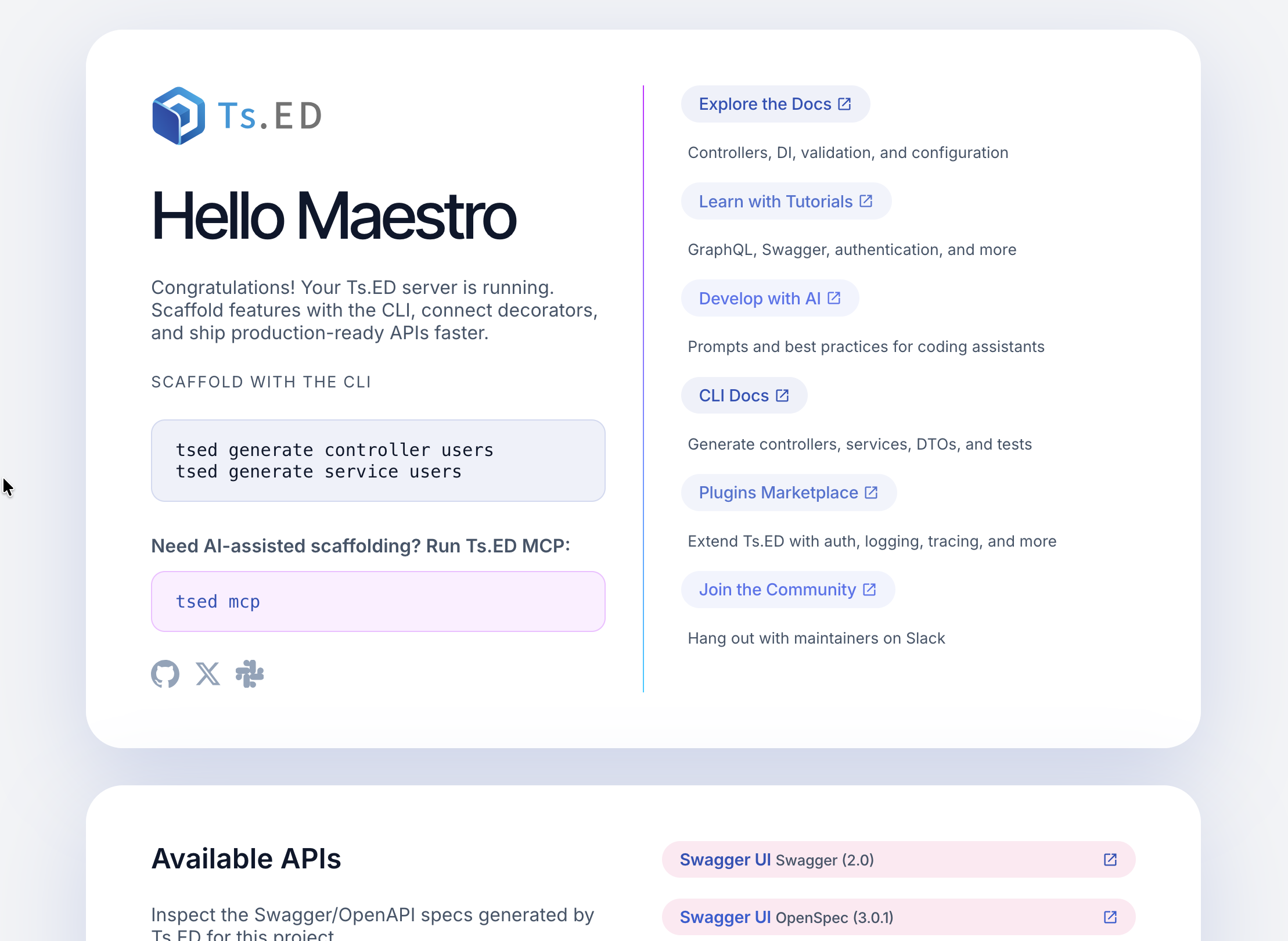 Run tsed mcp (or tsed-mcp) to expose commands, templates, and resources via the Model Context Protocol. V7 bundles stdio plus streamable HTTP transports, making it easy to point AI tooling at your CLI without shell access.
